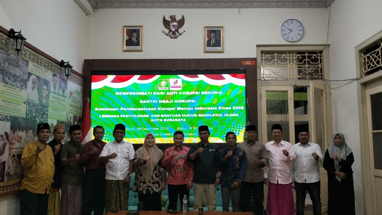 SURABAYA - Memperingati Hari Antikorupsi Sedunia (Hakordia) 2024, LPBHNU Surabaya menggelar santri ngaji korupsi bertajuk "Komitmen Pemberantasan Korupsi Menuju Indonesia Emas 2045", di kantor PCNU, Senin, (09/12), malam.